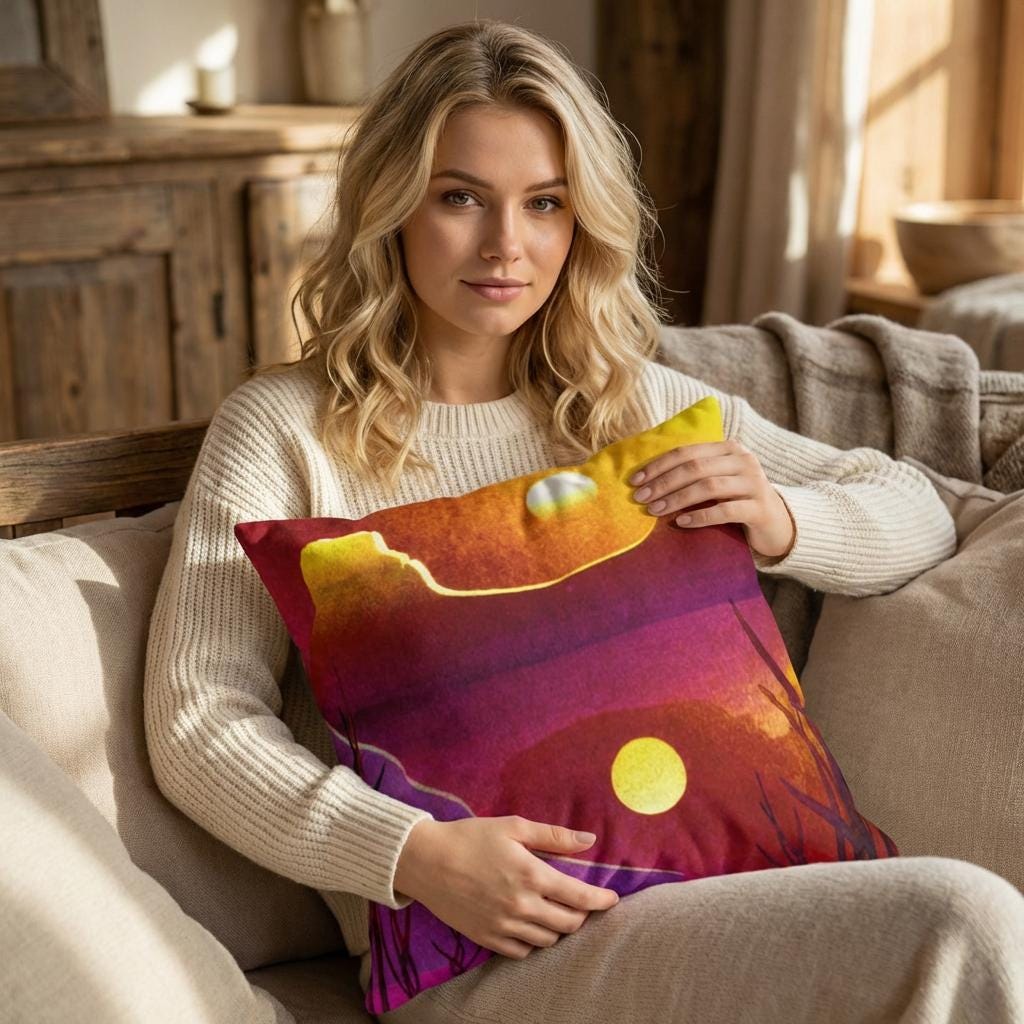 Enjoy the warm earth tones and luxurious feel of this faux suede golden sunset, guest house or office interior, sofa throw pillow.