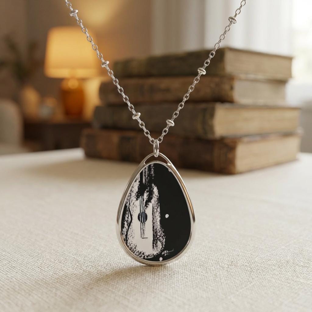 Add a flair of confident style to your outfit with this unique guitar art pendant, teardrop oval charm necklace, featuring a print of my original hand painted art.