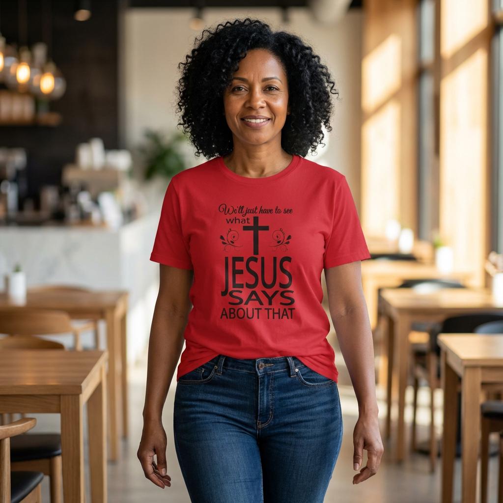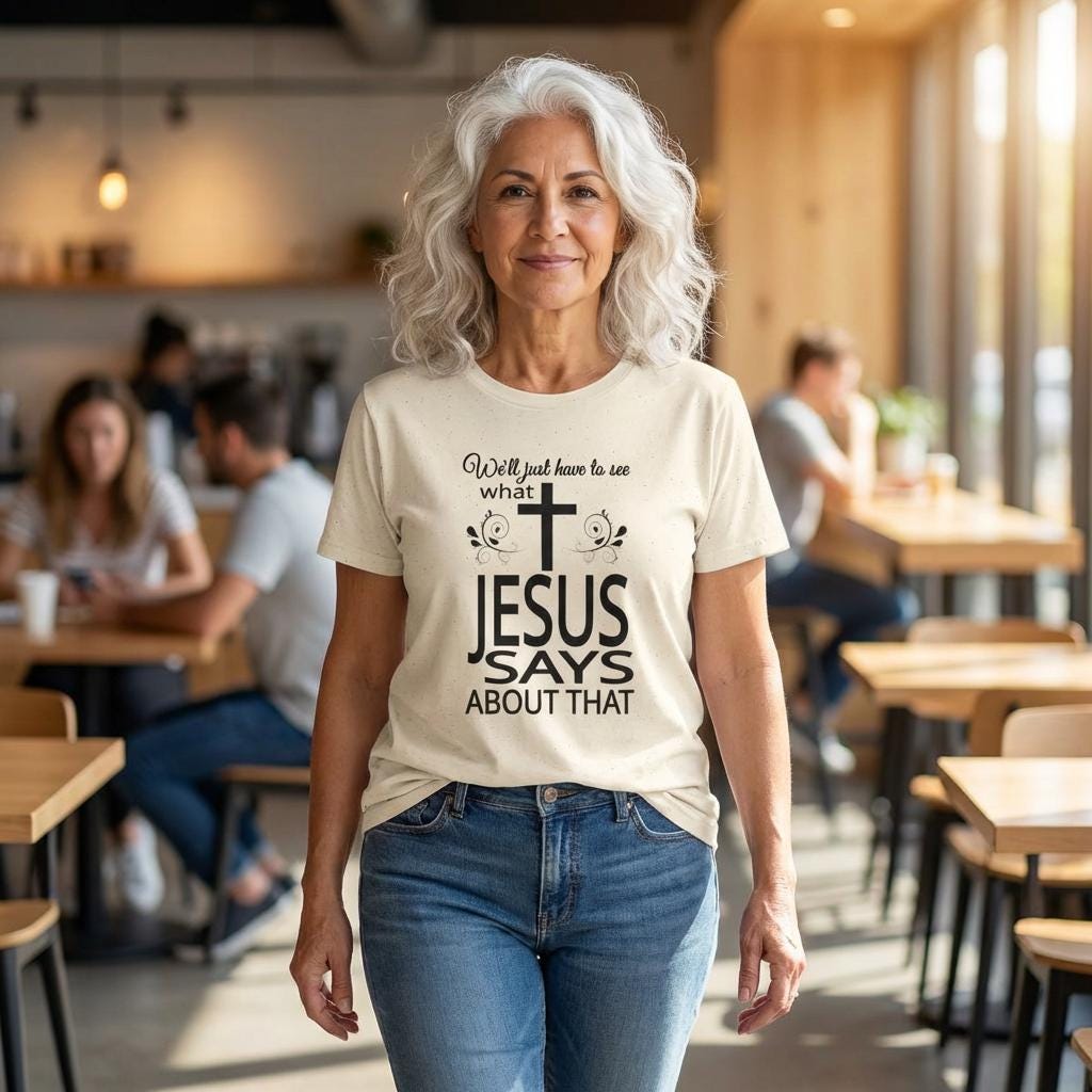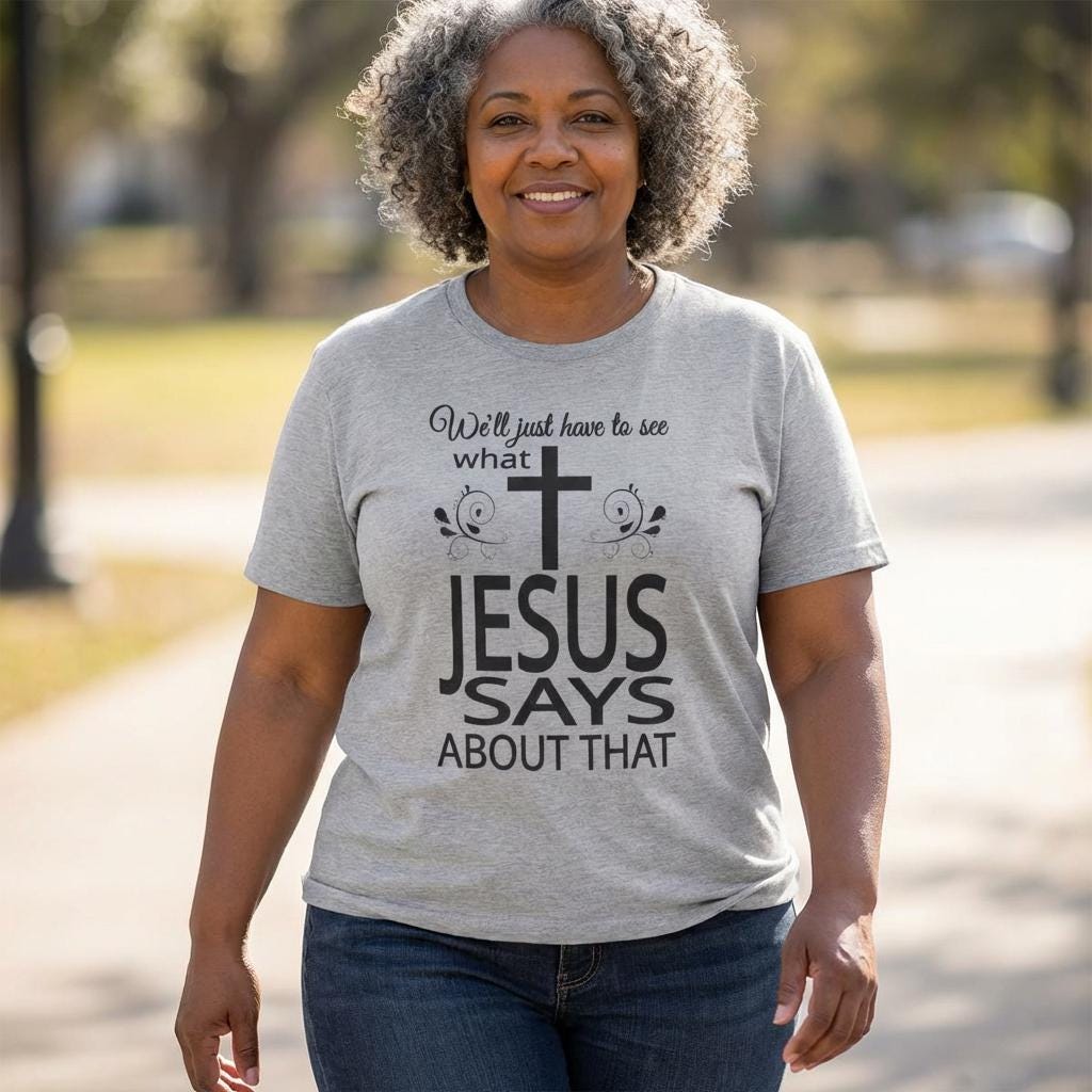 Soft lines and a clean monochrome print of this Christian shirt make it easy to pair with denim, a layered cardigan, or church-day slacks. The fabric drapes like a lived-in favorite and holds its shape through wash after wash, so the message stays clear and the shirt stays comfortable. The centered cross, and bold encouraging message are a gentle reminder: take a moment and listen to what Jesus says about that.