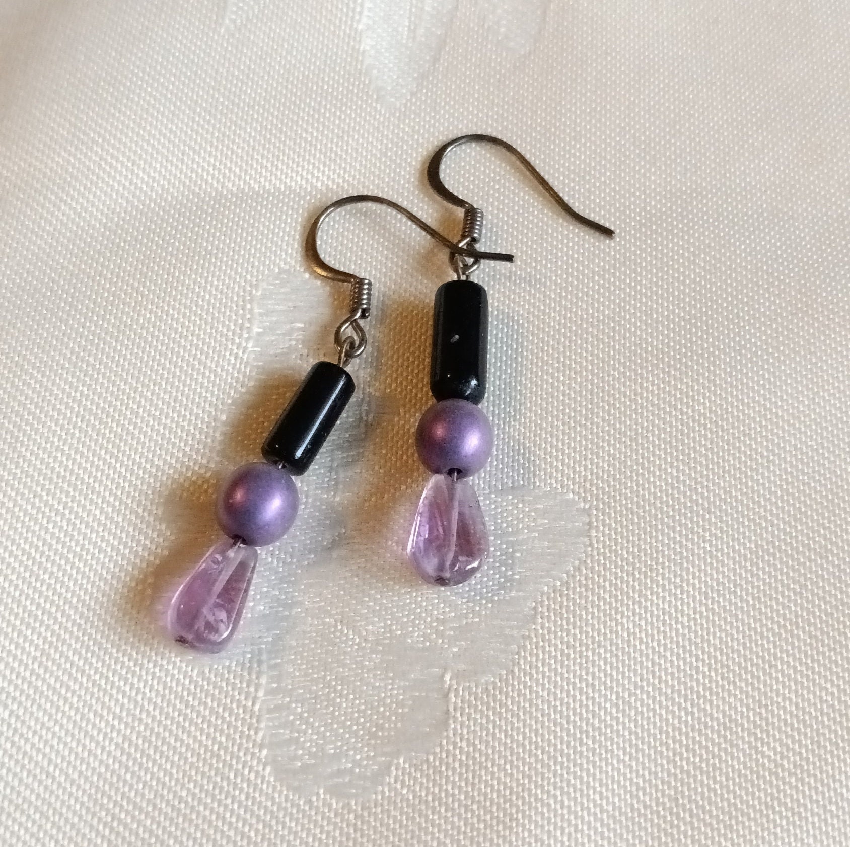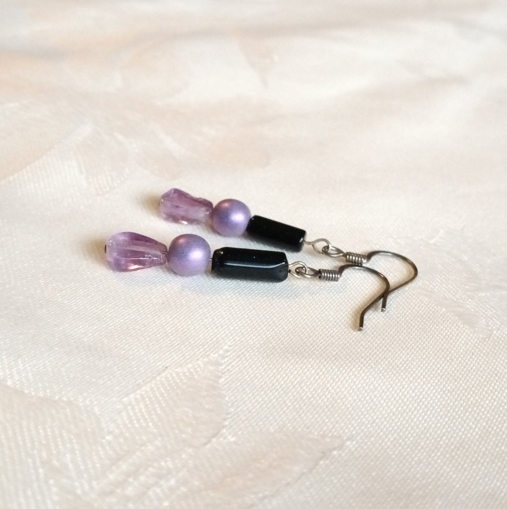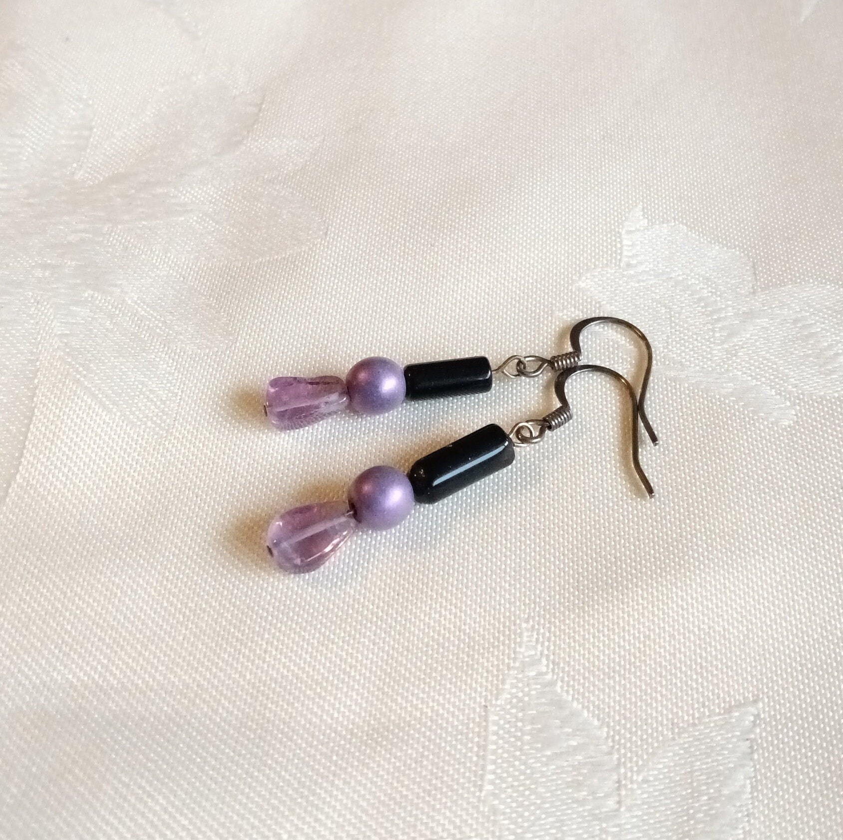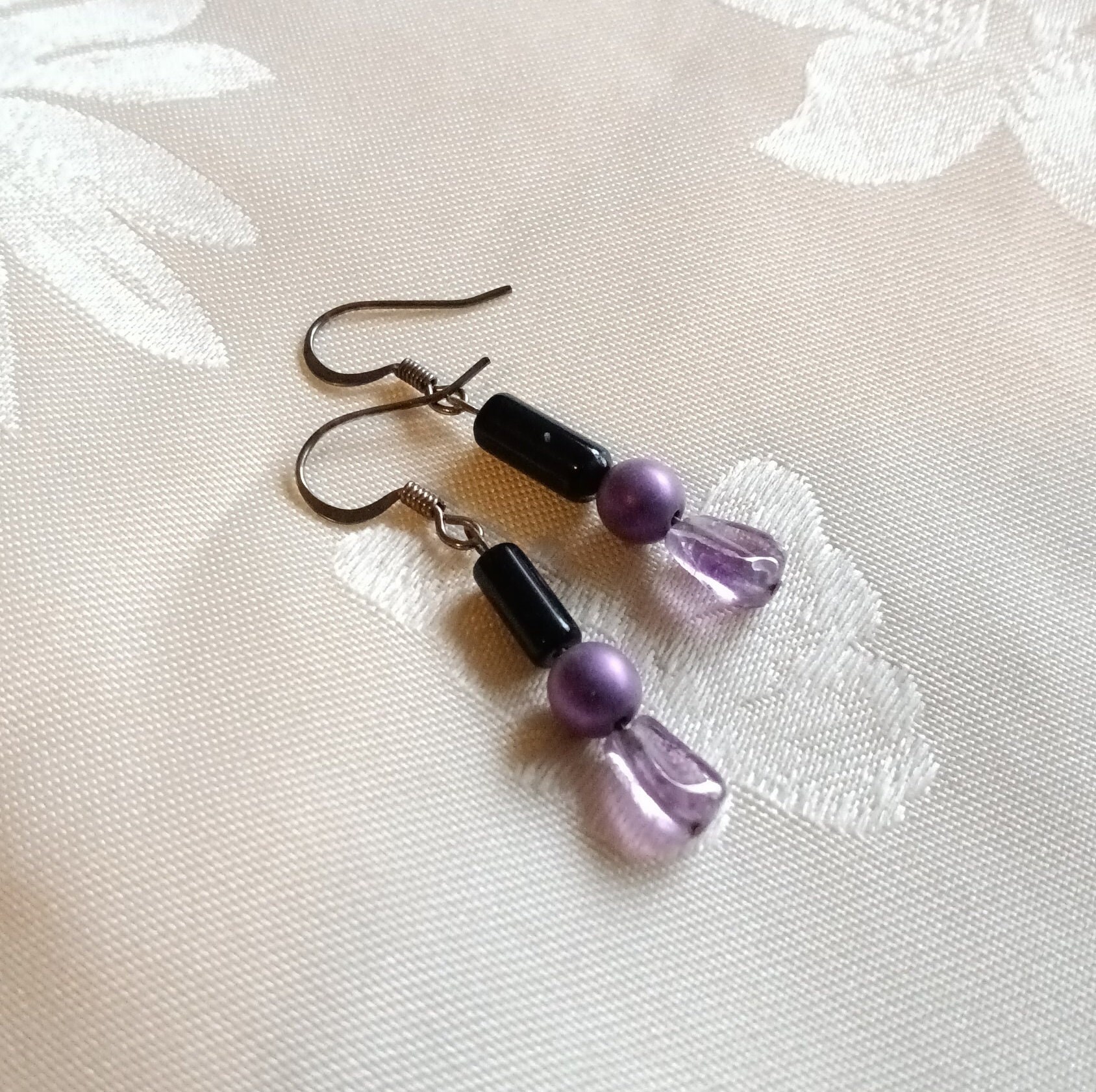 Amethyst dangle earrings with fine ceramic and acrylic heliotrope beads.