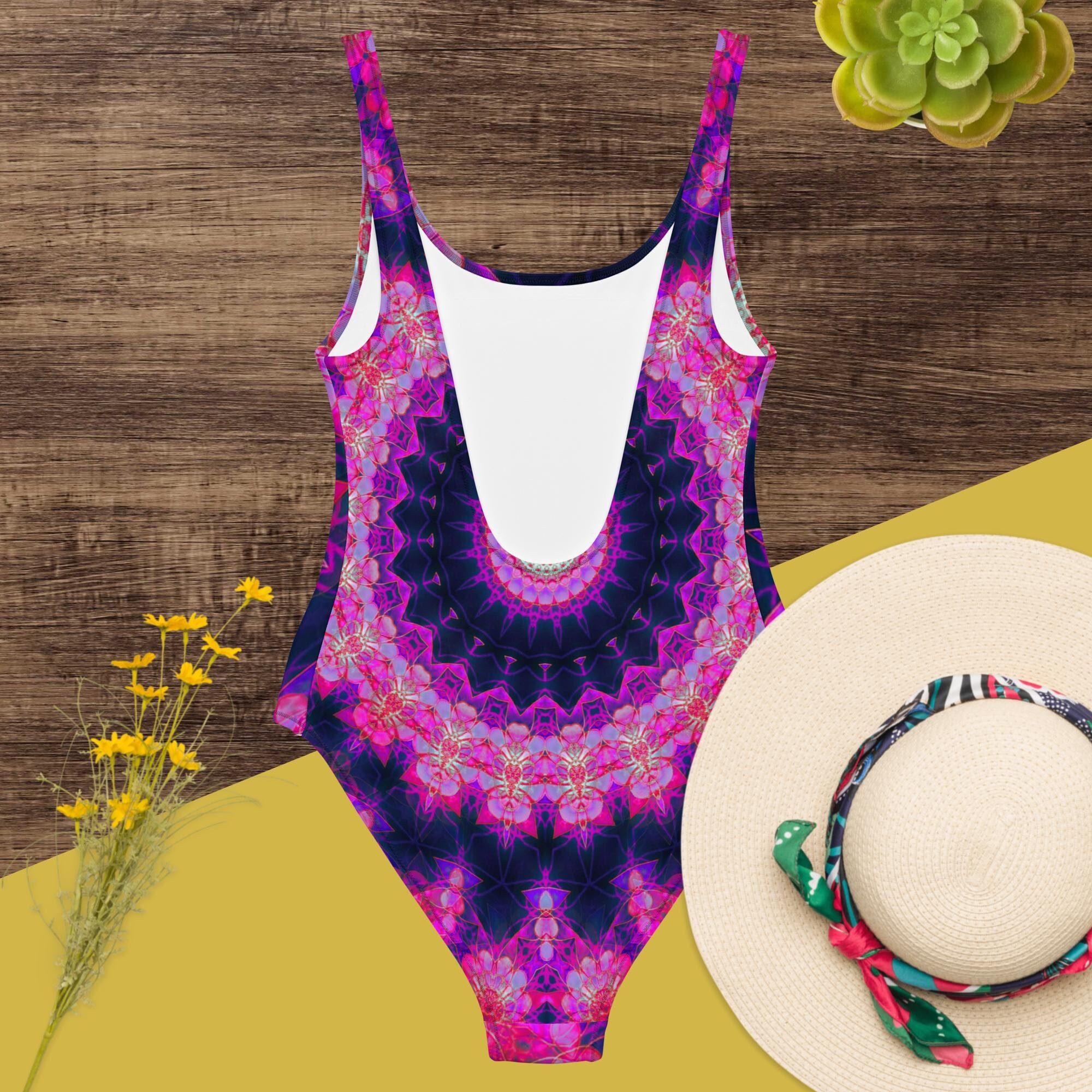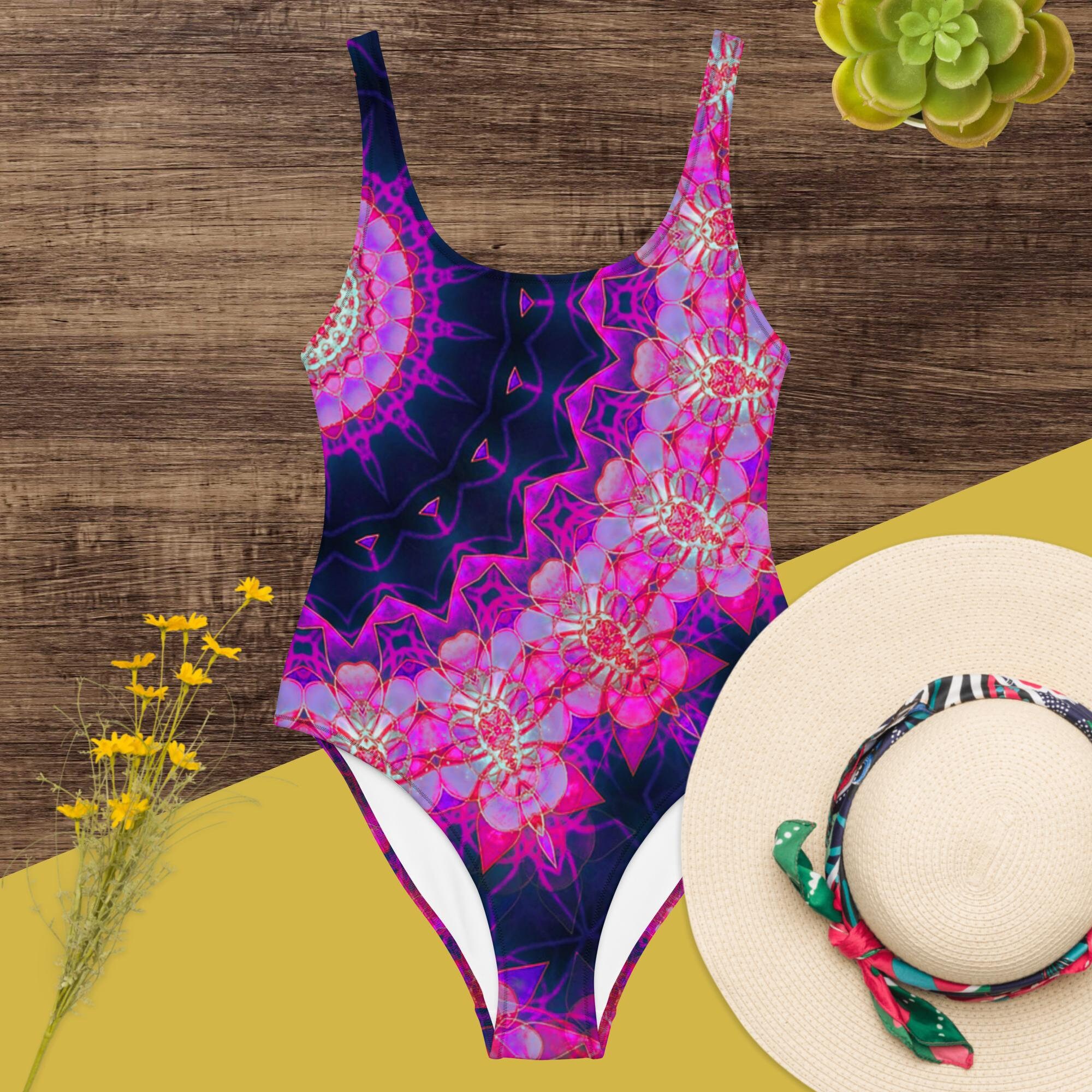 One piece plus size swimsuit fractal, mandala swimsuit leotard with double layer front.