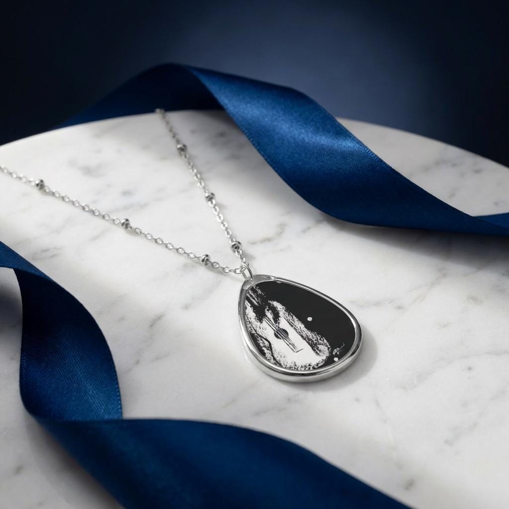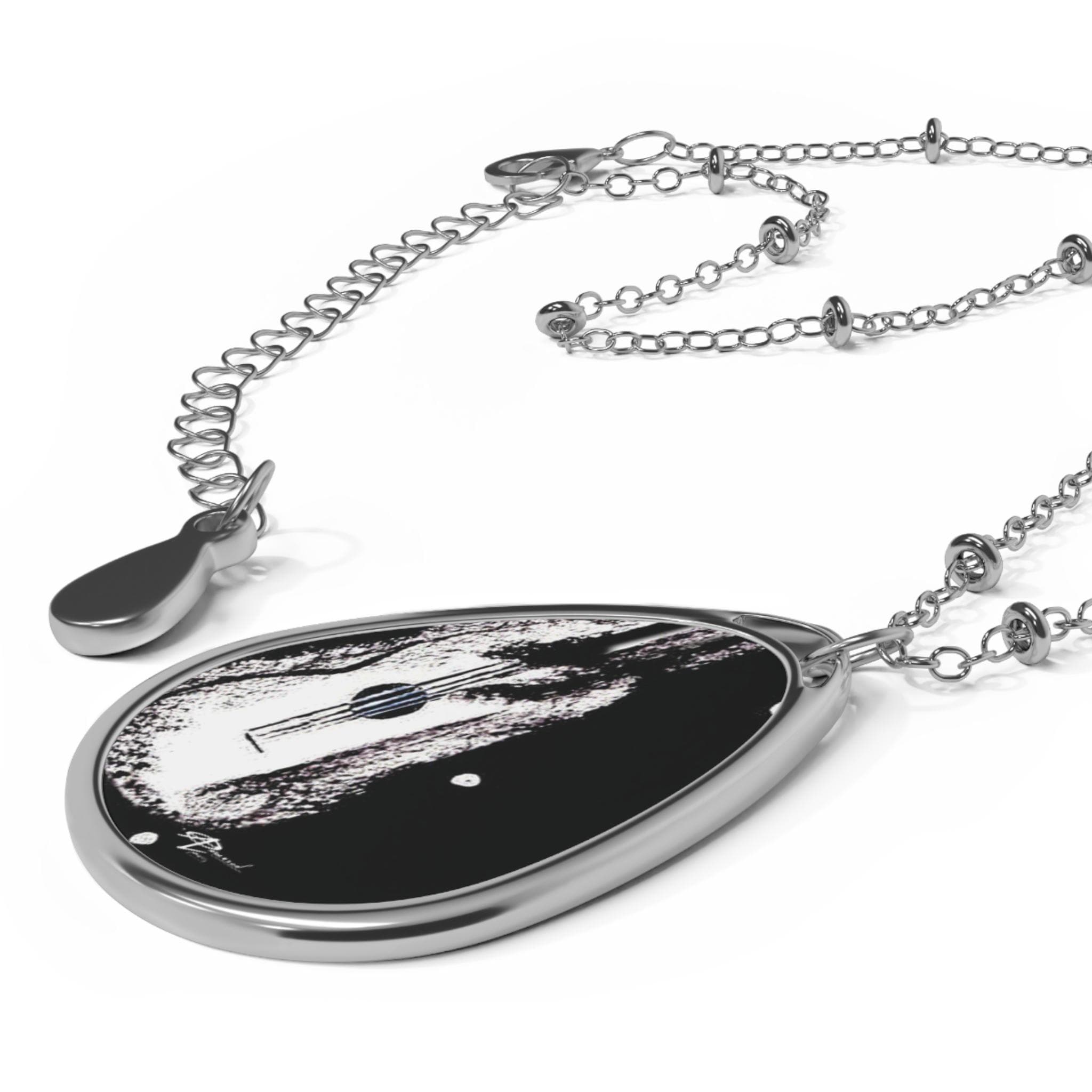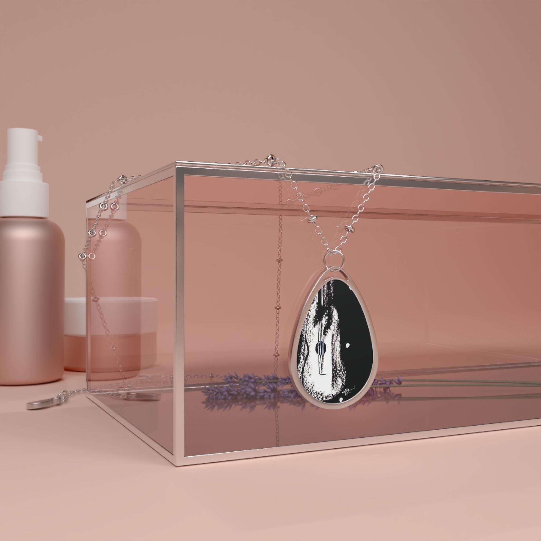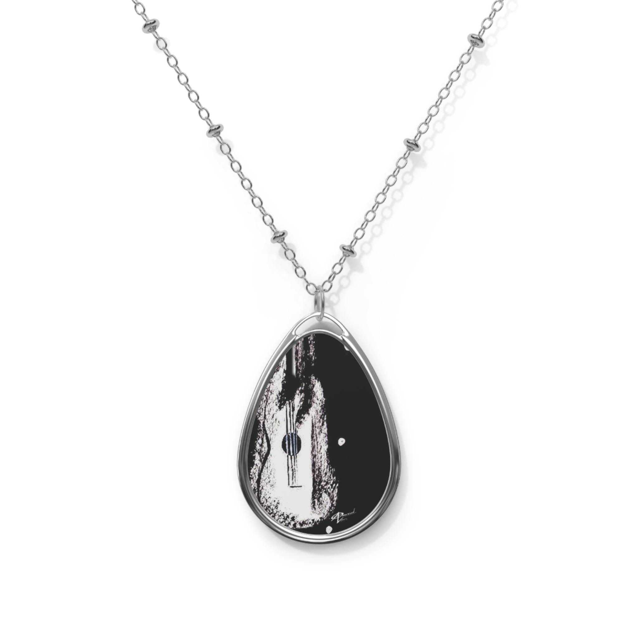 Add a flair of confident style to your outfit with this unique guitar art pendant, teardrop oval charm necklace, featuring a print of my original hand painted art.