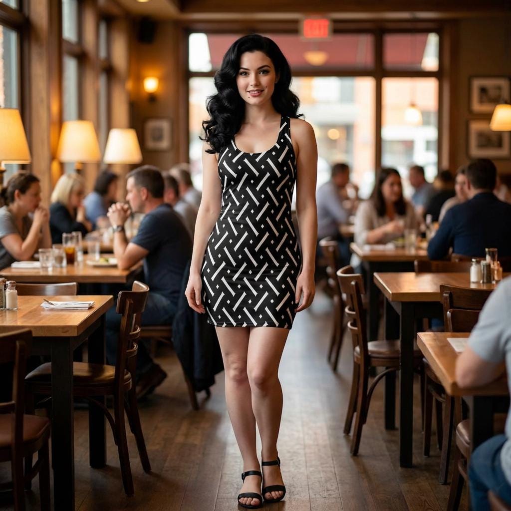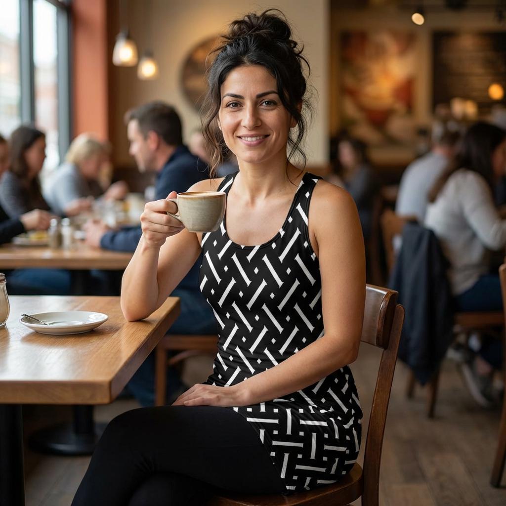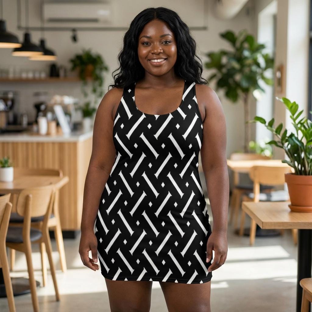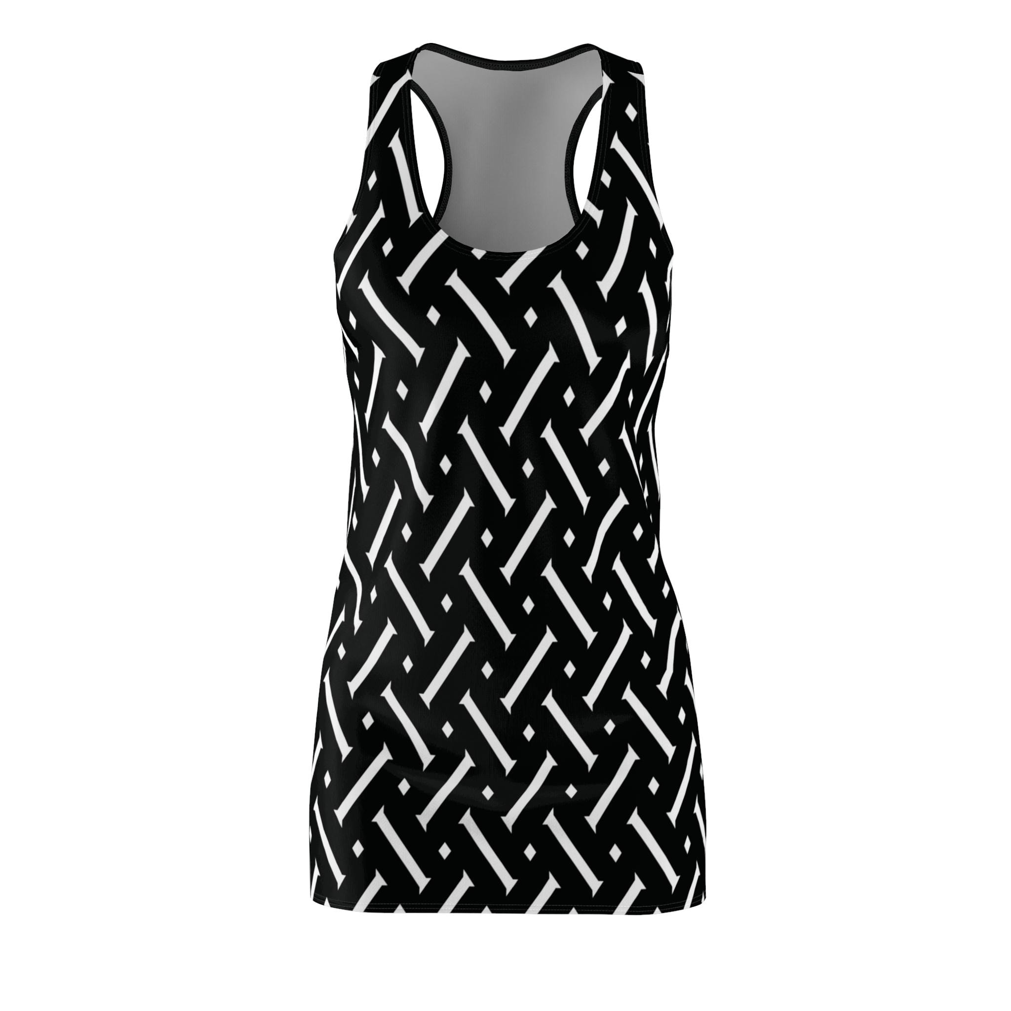 This lightweight black and white herring bone print racerback dress, brings a fresh, modern look to the classic print.