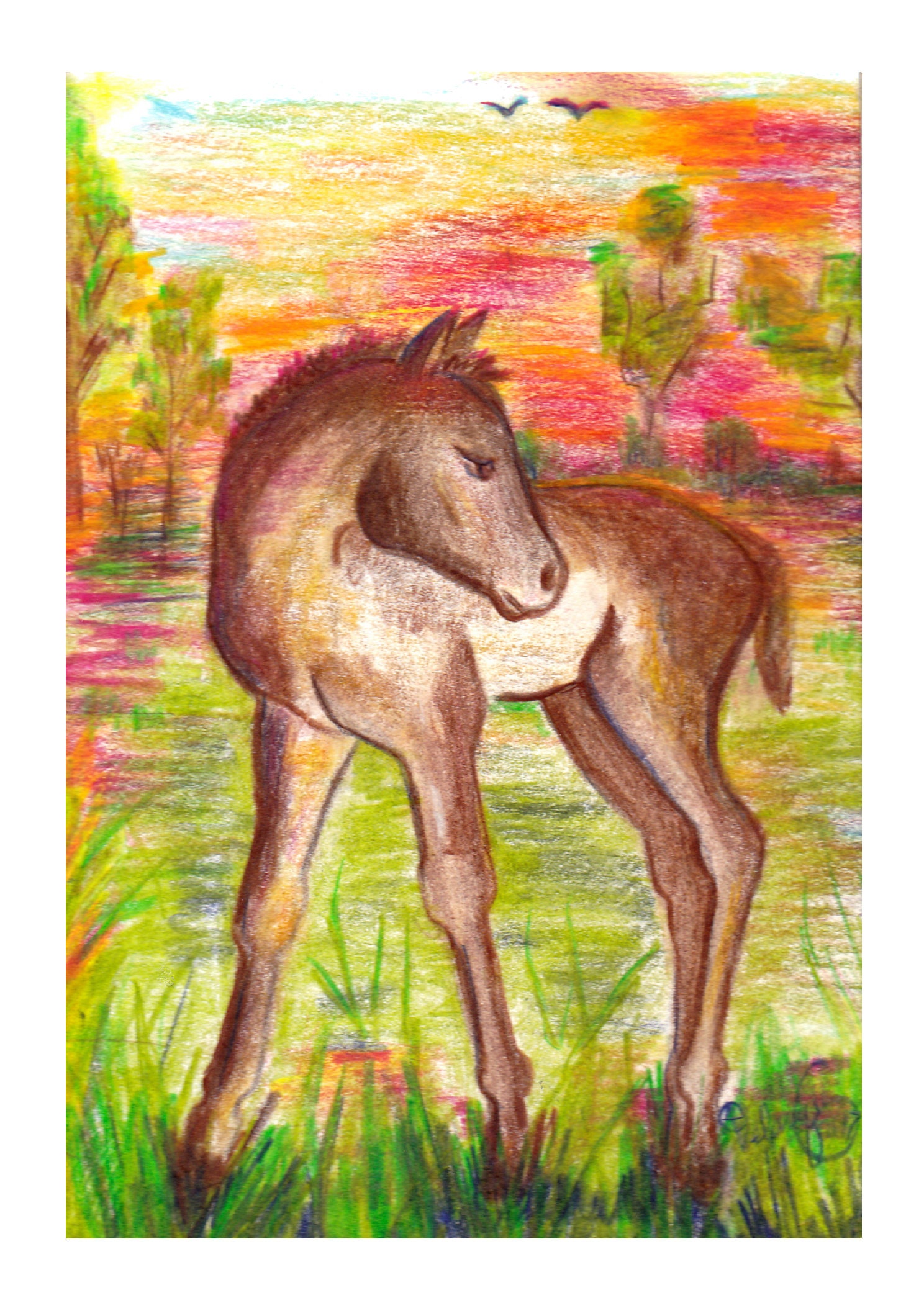 This horse art of a newborn foal, baby horse, makes a special décor for a kid's room or nursery wall art that will be part of a childhood memory your child will cherish and love for years to come.