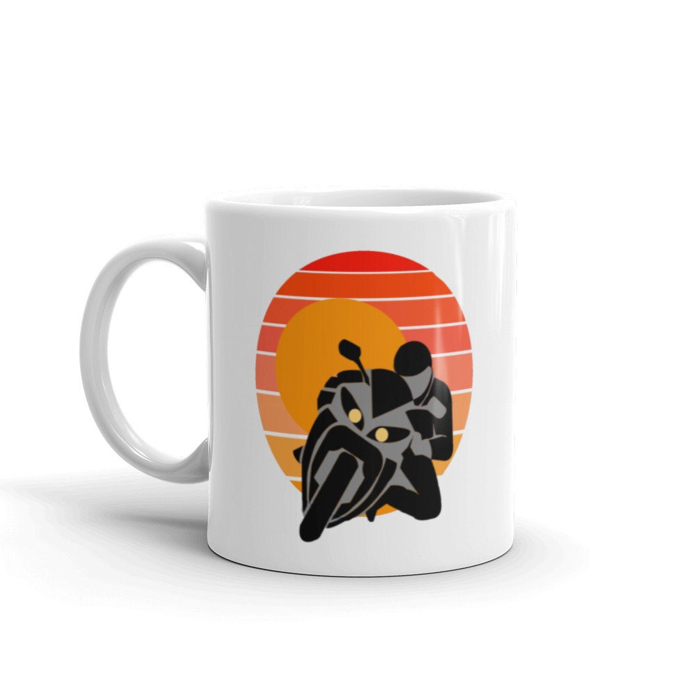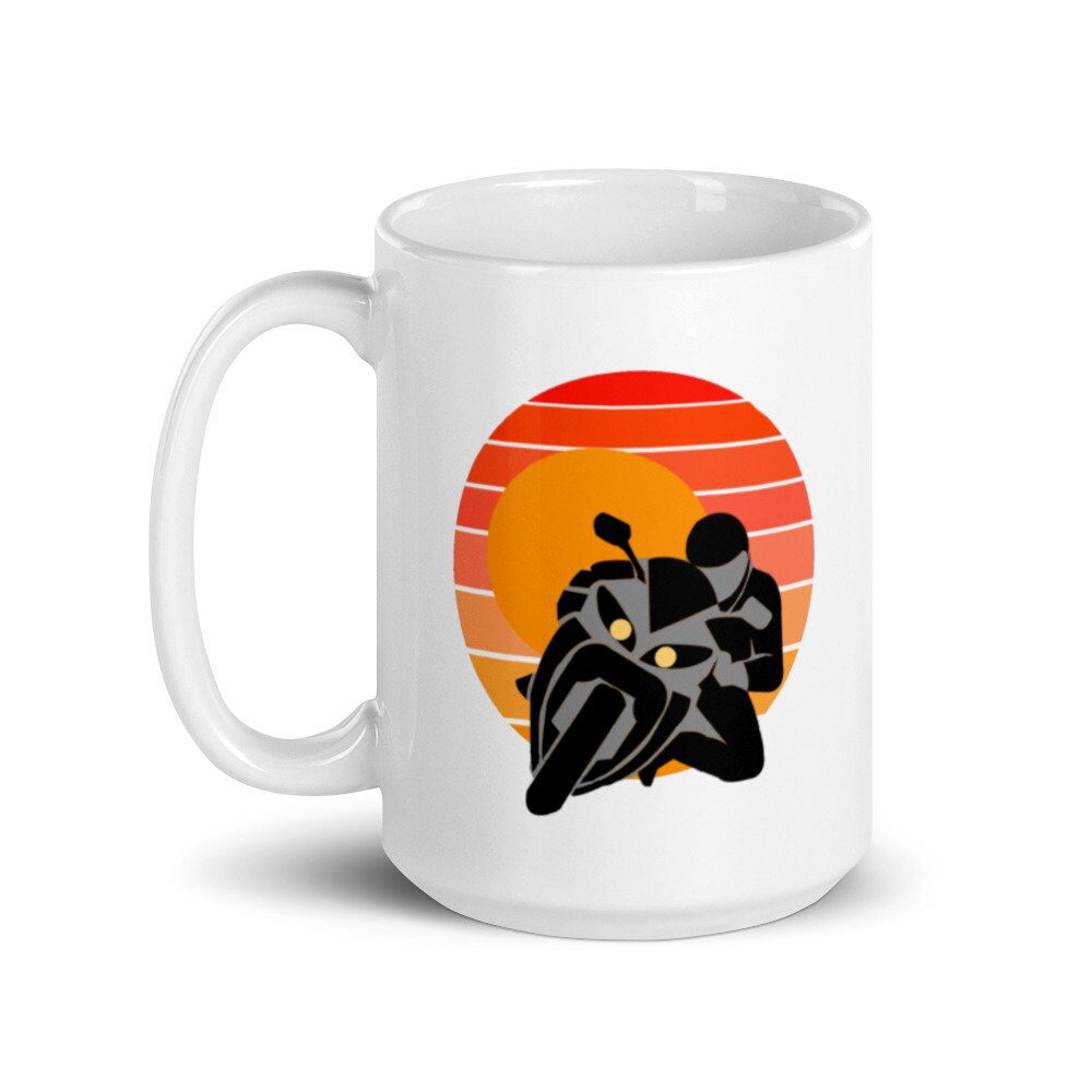 Capture the thrill of the ride every time you take a break with this dynamic sunset racing bike coffee mug.