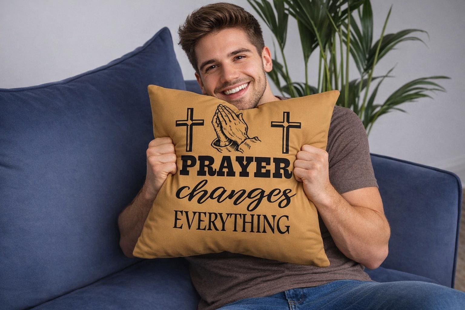 A well placed decorative accent pillow can bring the whole room to life, and this Christian home decor couch pillow is just what you need to do that. The inspirational quote is a warm reminder for the believer that prayer changes everything.